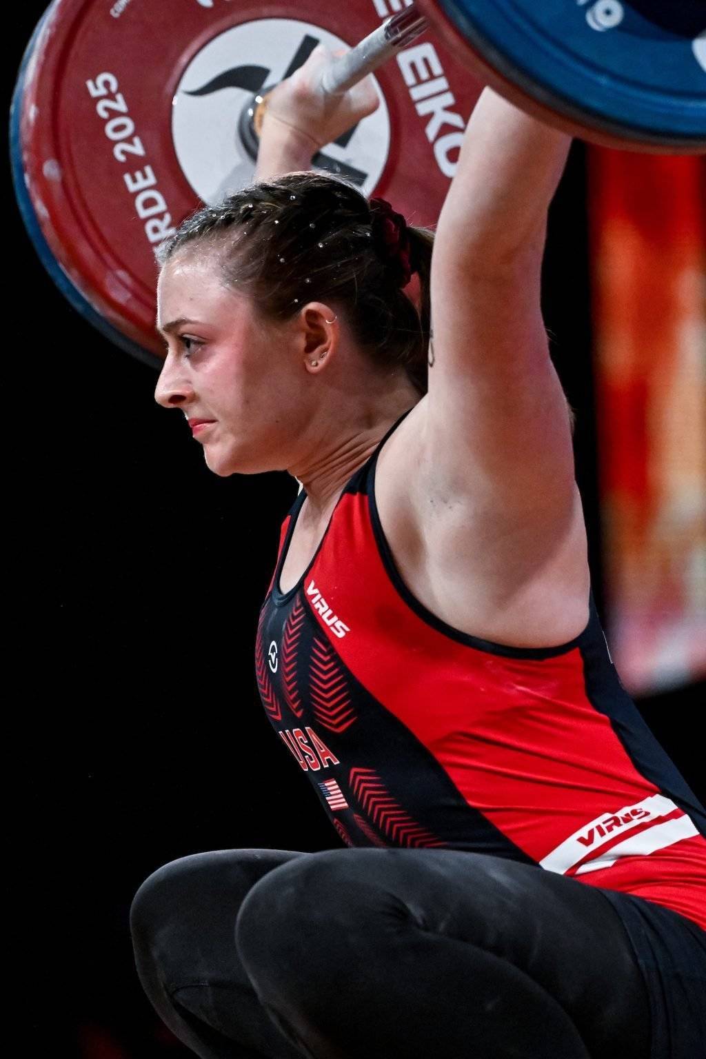 图为里夫斯在本届世锦赛中。图片来自海外举联官网里夫斯是巴黎奥运会女子71公斤级冠军。本次世锦赛她升到了77公斤级。比赛中,她以握举123公斤、挺举155公斤和总成绩278公斤连刷三项寰宇记录,实力碾压其他29位参赛者。