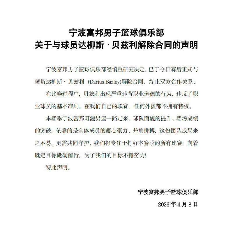 比赛浪漫后,宁波男篮快速响应,通知与贝兹利解约。球队在官方声明中暗意:宁波富邦须眉篮球俱乐部经持重斟酌决定,已至当天赛后持重与球员达柳斯·贝兹利(Darius Bazley)撤消左券,辨别两边相助相干。在比赛经由中,贝兹利出现严重起义业绩谈德的活动,违抗了业绩球员的基本准则。在咱们我方的联赛,任何外助王人不领有特权。